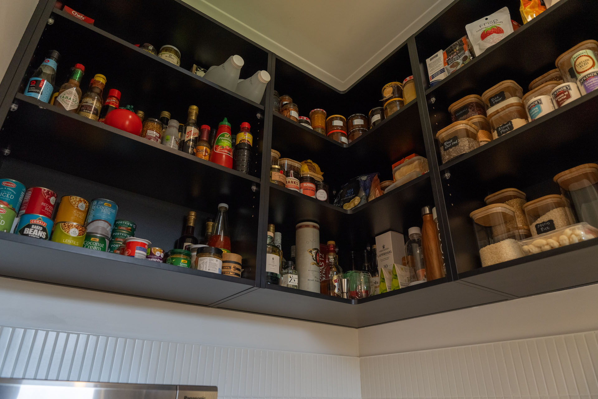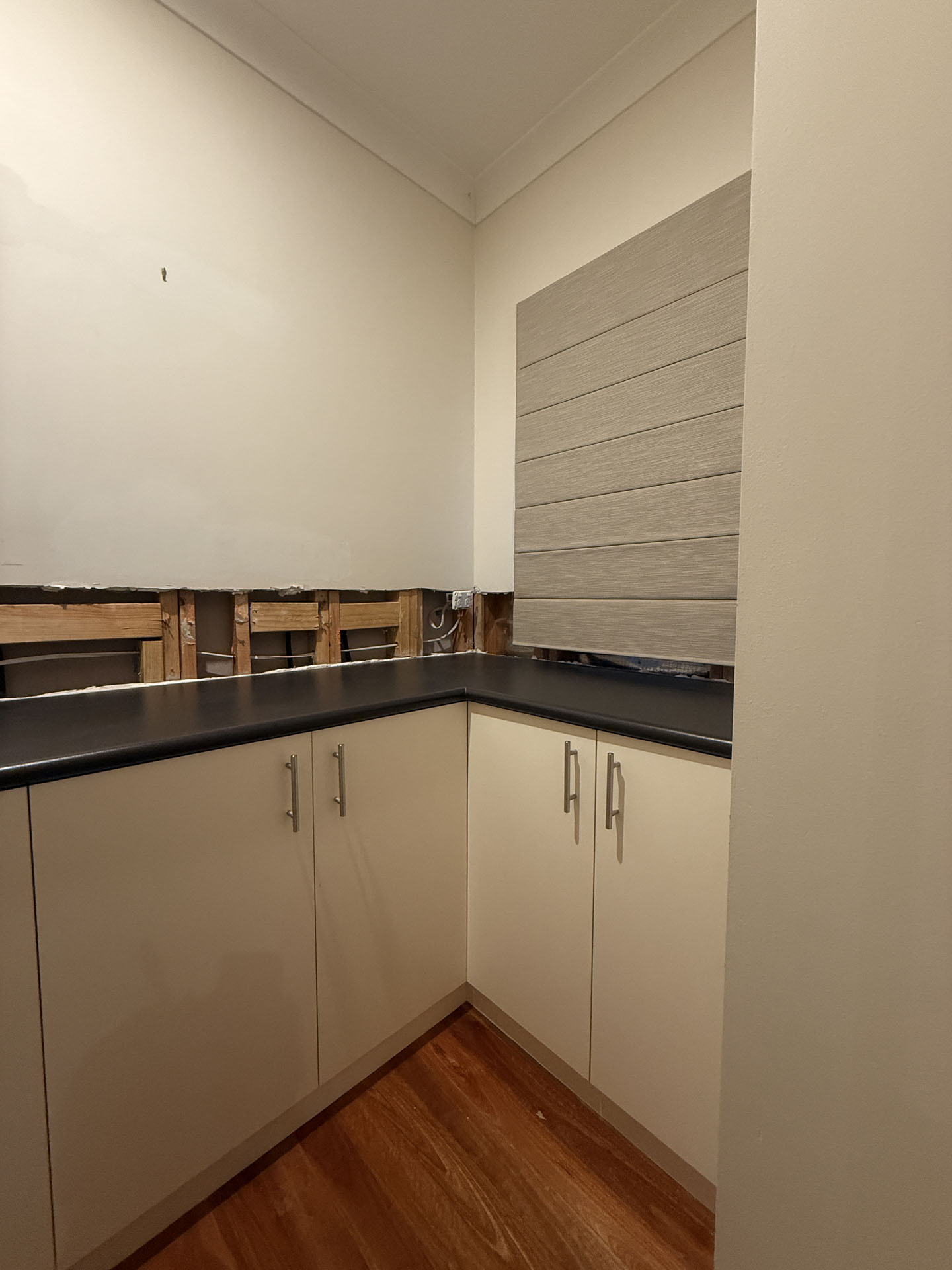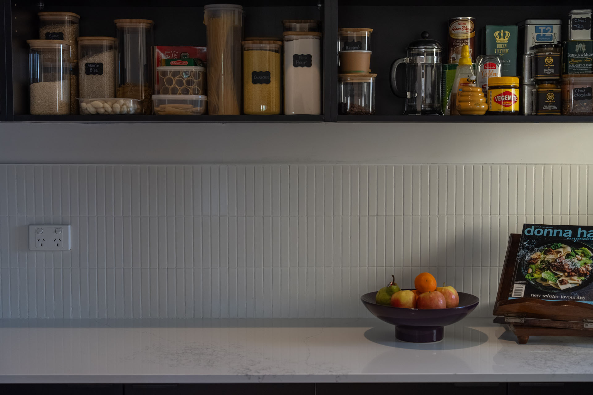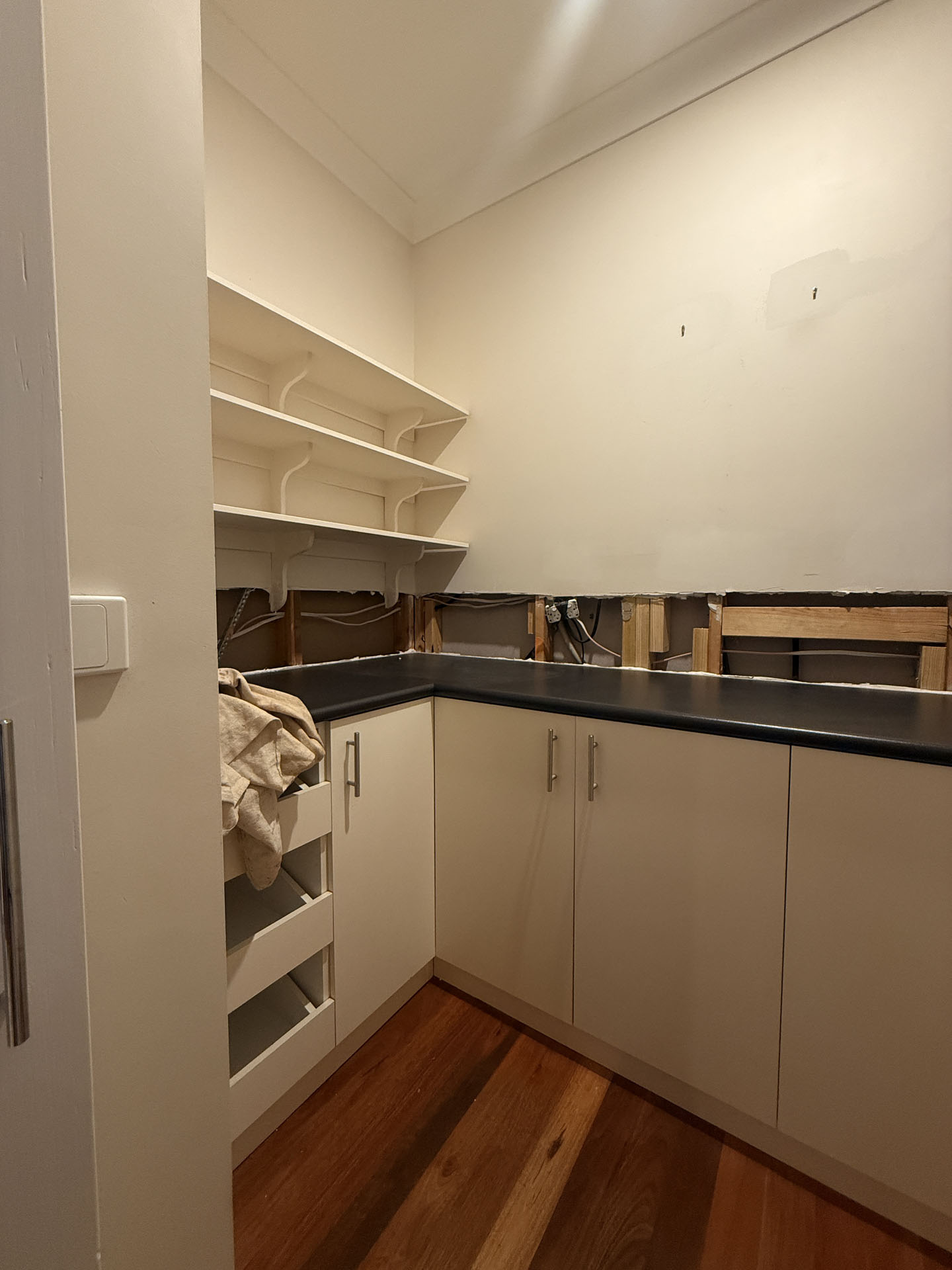 We completed a full kitchen facelift, replacing all doors, drawer fronts, panels, benchtop, and hardware, while also adding additional cabinetry within the pantry to improve storage. To create a contemporary finish, fluted glass doors were introduced, paired with slim vertical tiles on the splashback. Open pantry cabinetry was finished in black to tie in with the door finishes and add depth to the space. As the client already had their own plumber and electrician, we coordinated clear timelines and staging to ensure all trades worked seamlessly together. The result is a cohesive, modern kitchen and pantry that complements the rest of the home and presents beautifully for sale, delivering a low fuss transformation that the client was extremely happy with.